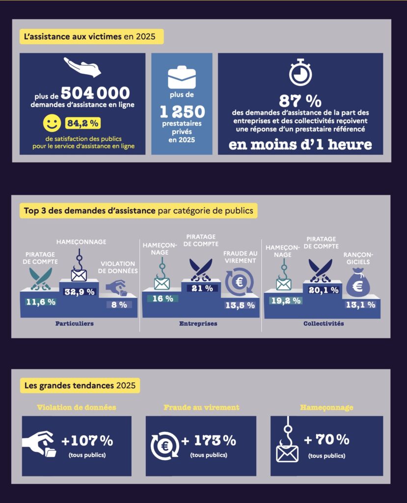 L’année 2025 se distingue par une explosion des violations de données, qui ont exposé les informations personnelles de millions de Français. Cette tendance se traduit par une hausse de 107 % des demandes d’assistance liées à ces incidents. L’exploitation malveillante de ces données alimente directement l’hameçonnage, devenu la première menace tous publics confondus, avec une progression de 70 %. Les cybercriminels multiplient les approches via SMS, courriels ou appels, souvent personnalisées, pour mener des arnaques ou pirater des comptes en ligne, une menace particulièrement marquée chez les professionnels (+45 %).