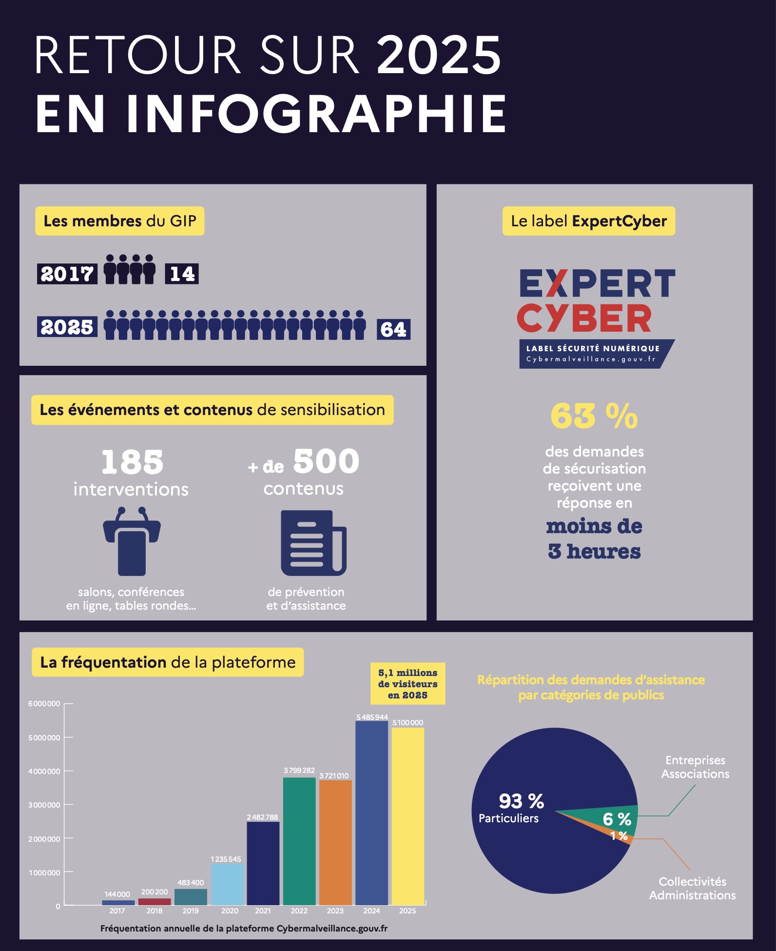 L’année 2025 marque un tournant décisif pour Cybermalveillance.gouv.fr, dont l’activité n’a cessé de croître face à une menace numérique toujours plus intense. Pour la deuxième année consécutive, la plateforme dépasse les 5 millions de visiteurs et atteint désormais 22 millions d’utilisateurs cumulés depuis son lancement en 2017. Cette progression s’explique par une demande accrue d’assistance, mais aussi par plusieurs actions de sensibilisation d’envergure, comme le lancement du 17Cyber, l’opération Cactus auprès des jeunes, la campagne du Cybermois ou encore le CyberTour de France.
